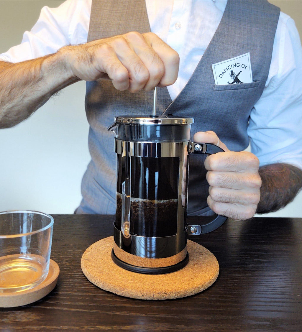 8. Press. Press the plunger down slowly. Once you've reached the bottom it's time to enjoy! Serve immediately and pour remaining coffee into another carafe to stop the brewing process.